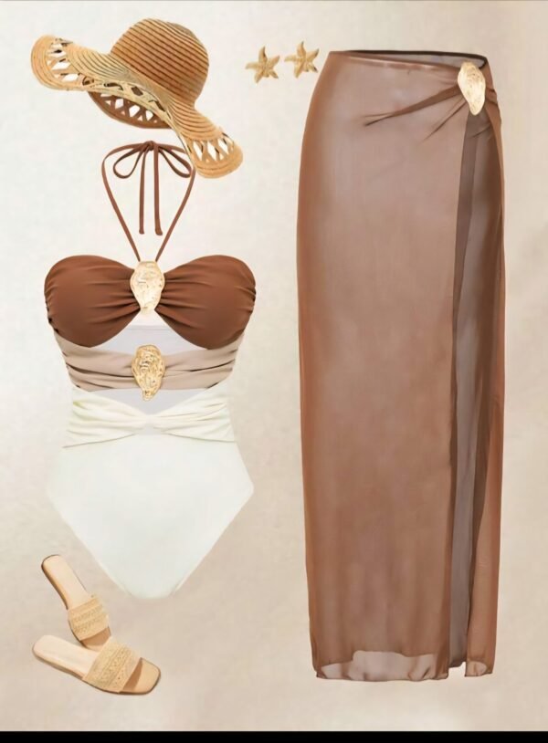 With its all-in-one functionality and timeless aesthetic, this bikini and mesh cover-up pairing makes summer styling effortless. Whether you’re snapping unforgettable vacation photos or simply enjoying the waves, the One Piece Tie Neck Bikini with Mesh Cover Up ensures you feel confident and fashionable throughout.